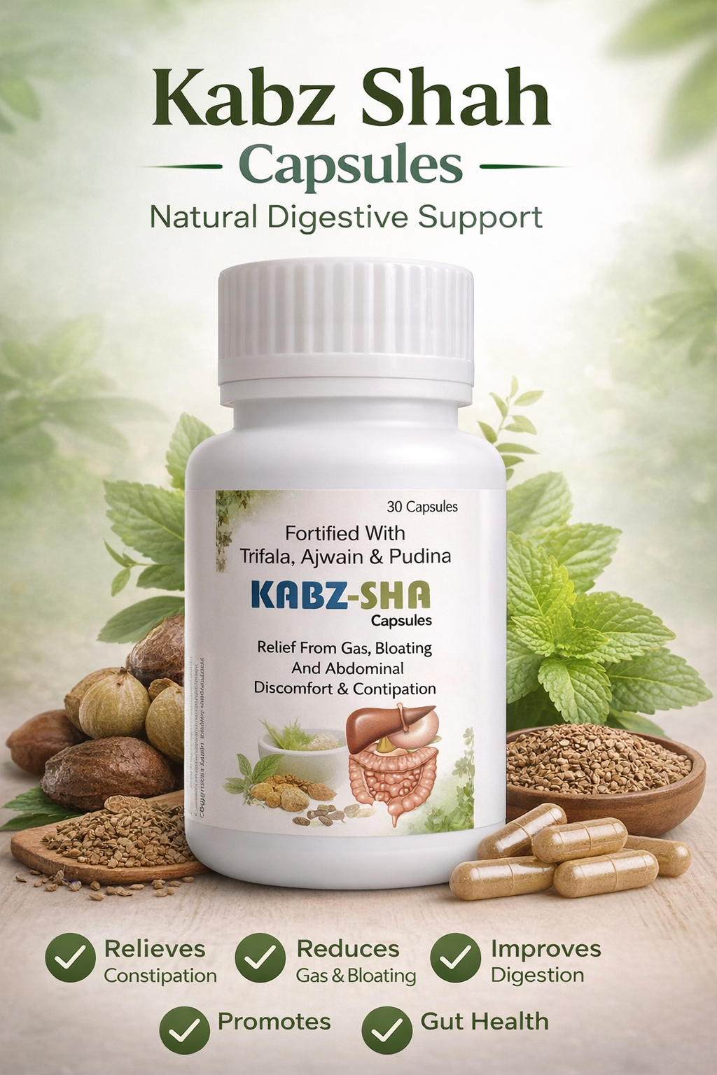 Kabz Shah is an Ayurvedic herbal capsule that helps improve digestion and supports regular bowel movement for natural constipation relief.